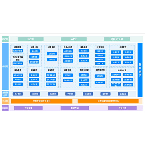 设备全生命周期管理系统自下而上由数据层、底层架构、支撑层、服务层和用户层内容构成。在系统功能方面,它覆盖了设备资料管理、备品备件管理、点巡检管理、维修管理以及设备变更管理等环节,实现了从设备登记到报废的全生命周期闭环管理;平台建设层面,基于先进的技术框架构建,提供包括字典管理、组织管理在内的多种系统服务,同时支持流程引擎、文件预览等功能,为应用开发提供坚实的技术基础和保障;在应用层面上,通过对收集的数据进行智能分析,实现设备故障诊断与预警,结合具体的业务需求,提供全面的设备管理和维护解决方案,从而确保设备的高效稳定运行,并支持用户的多样化需求。